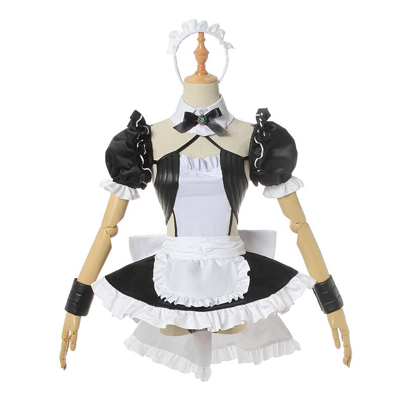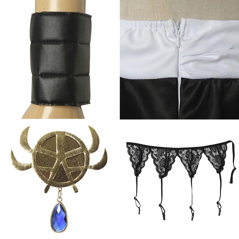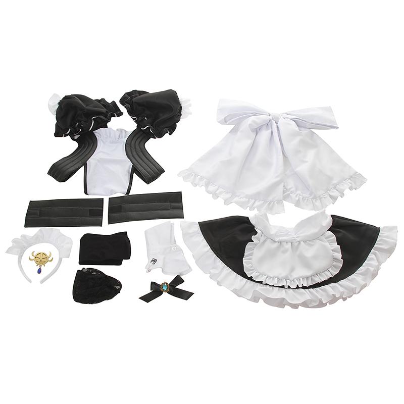 Los elementos incluidos: ropa interior, falda, brazaletes, ligas, calcetines, diadema, corbata de lazo, tocado